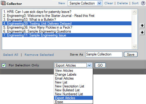 - Erase: If you have permission, you can use the collector to select articles and erase them all at the same time.