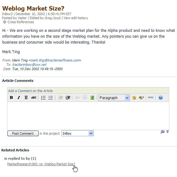 Here is an example of an email sent into a Traction space that allows Visitor to Author by Email. It is from Mark Ting who doesn't have a user account, therefore it is displayed as Posted by Visitor. The email header information is displayed below the article text.