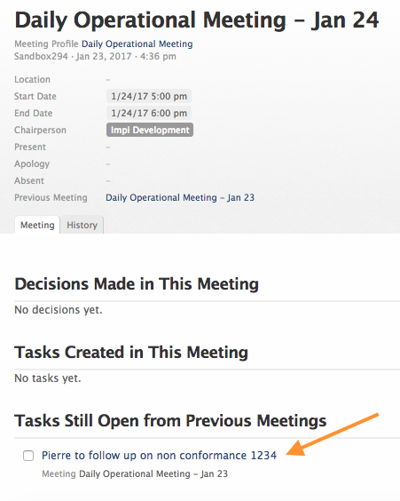 The resulting solution allows the team to capture on the go tasks and decisions associated to the meeting profile. Past open tasks are always on the radar screen, thus reinforcing accountability. Information retrieval is immediate in the context of the meeting. The plug-in is a productivity tool and a time saver. Example of usage of the standard meeting plugin would be for management and senior management meetings, project reviews, management reviews, compliance/