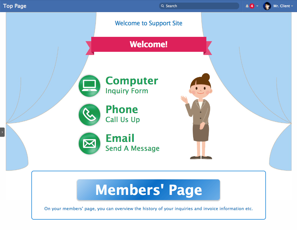 For example, the support requests, on-site remedy schedules, and the other articles and comments posted in the "Client A" room are allowed to be viewed by Client A only. They can not be seen by the other clients.