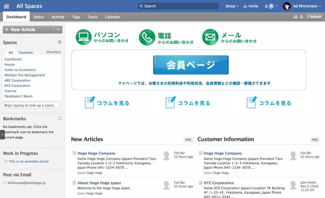 On the standard front page of TeamPage, you can arrange sections such as "New Articles" and "New Tasks" like a newspaper, or you can put a specific article on it like a poster.