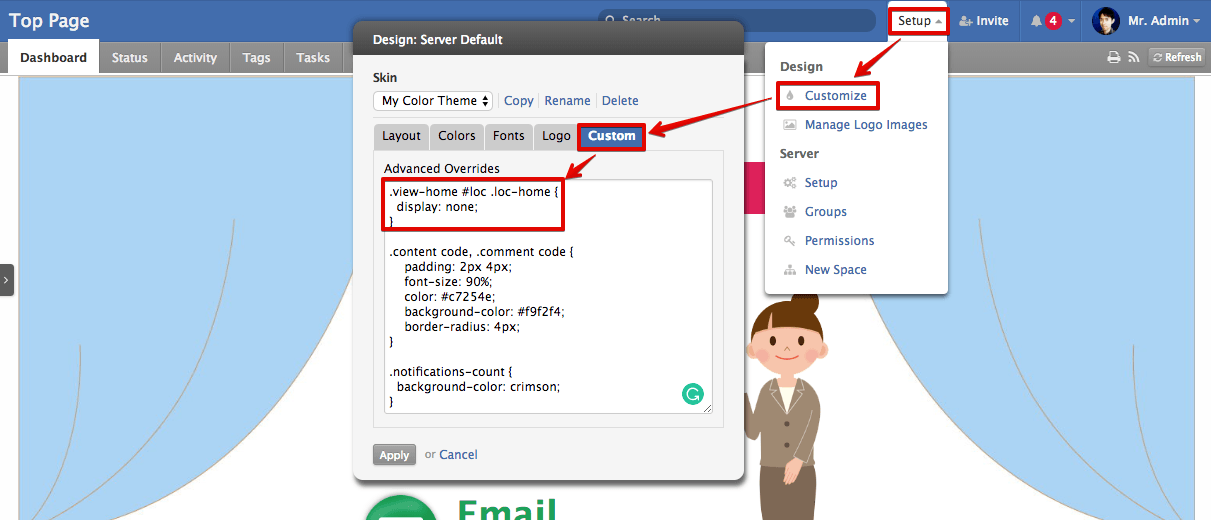 The "Setup" menu shows up only when a user logs in to TeamPage as an administrator. Since clients who post inquiries are not administrators, this menu will not be displayed. Therefore, customization is unnecessary.