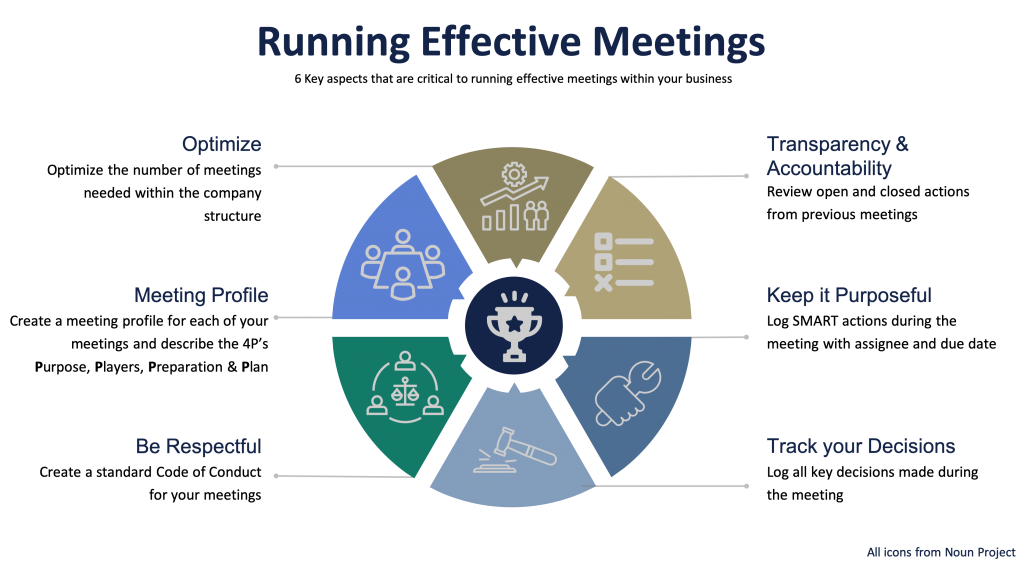 Through observation and experimentation with our customers, we have identified 6 aspects that are critical to running effective meetings within your business.