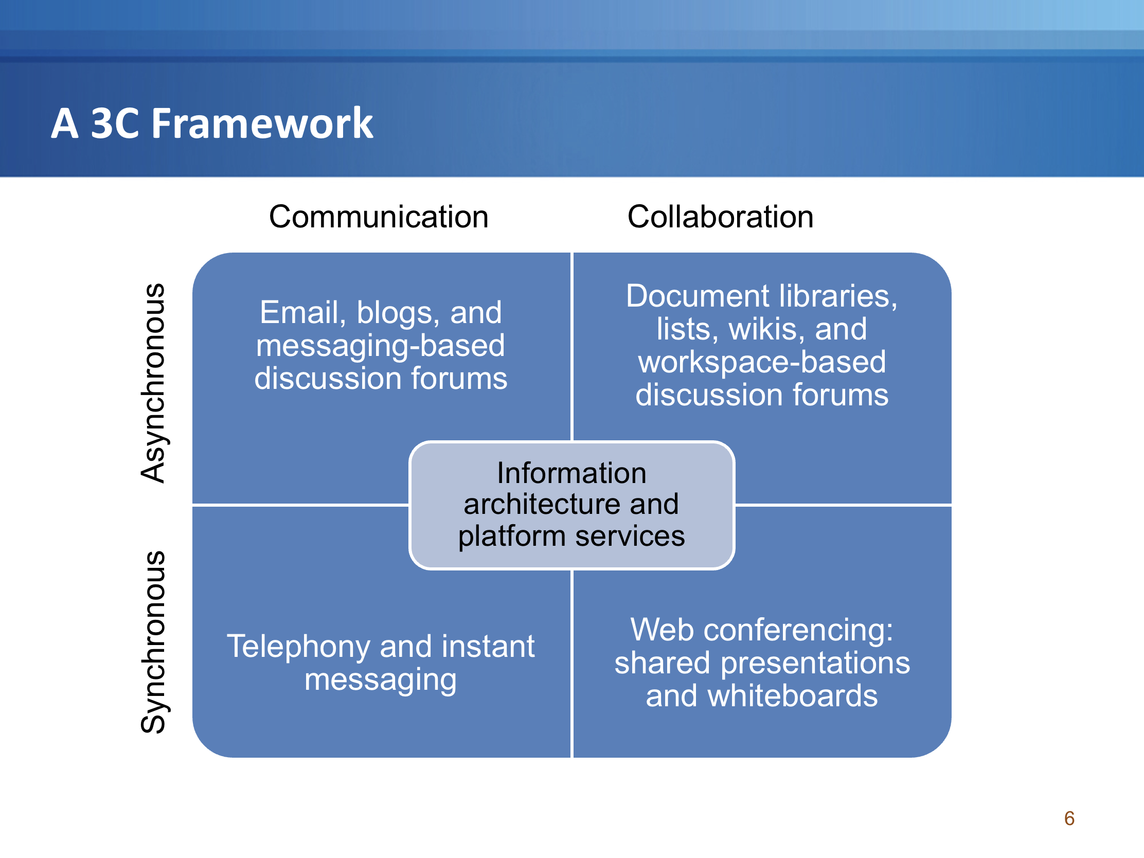 Peter O'Kelly 6:00 Very briefly communication is just about the transmission of information from point A to point B. That's it usually comes in different communication channels, items and channels. Collaboration is joint purposeful work. It usually happens in workspaces with shared artifacts. Everybody gets it that communication is that is asynchronous communication. emails, the biggest one there I'd argue are blogs, and some NNTP or Usenet style discussion forums are also communication channels. Most people understand real time or synchronous communication is dominated by telephony and instant messaging, web conferencing for synchronous collaboration, most people understand that probably at least participated in web conferences and things like Live Meeting, and WebEx.