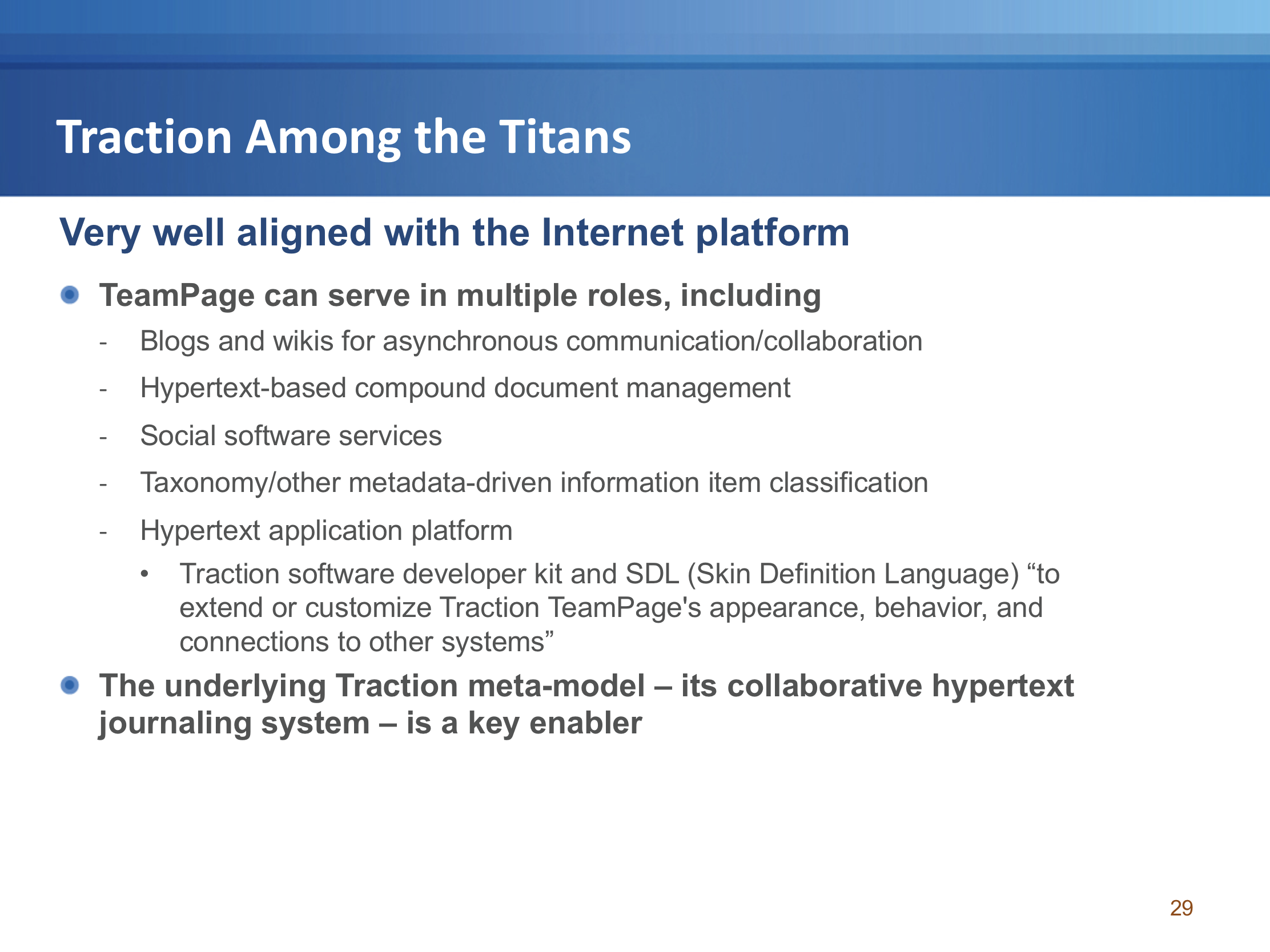 Peter O'Kelly 1:54 I'm going to talk about the Battle of the Titans that's going on right now because there's a very intense platform versus focused or best of breed, player kind of battle going on right now. Then I'll talk about where I see Traction fitting in and talk about a few cultural considerations. It's interesting for me, especially having been involved with Notes going back to the late 1980s. It's interesting to hear, these are perennial challenges, the sorts of things we've been discussing this morning.