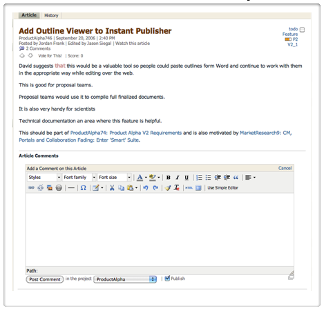 Single Page View: Here you can see the article and its tags which include assignment of content type (Feature), status (To Do), priority (P2), and milestone (V2_1).