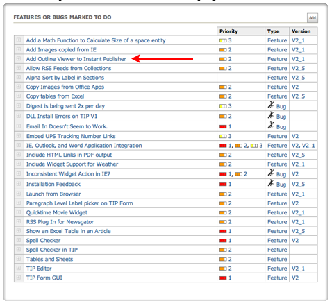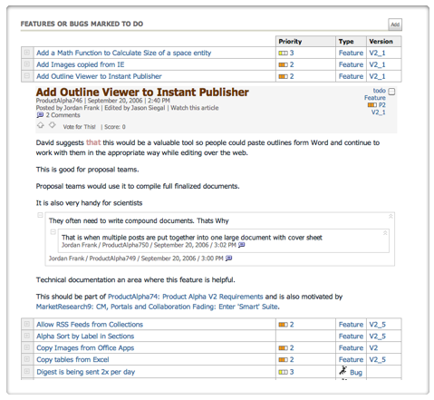 By way of illustration, here is an example of a product Feature displayed in its article / page view, then represented in a table which has sortable columns for priority, status and milestone.