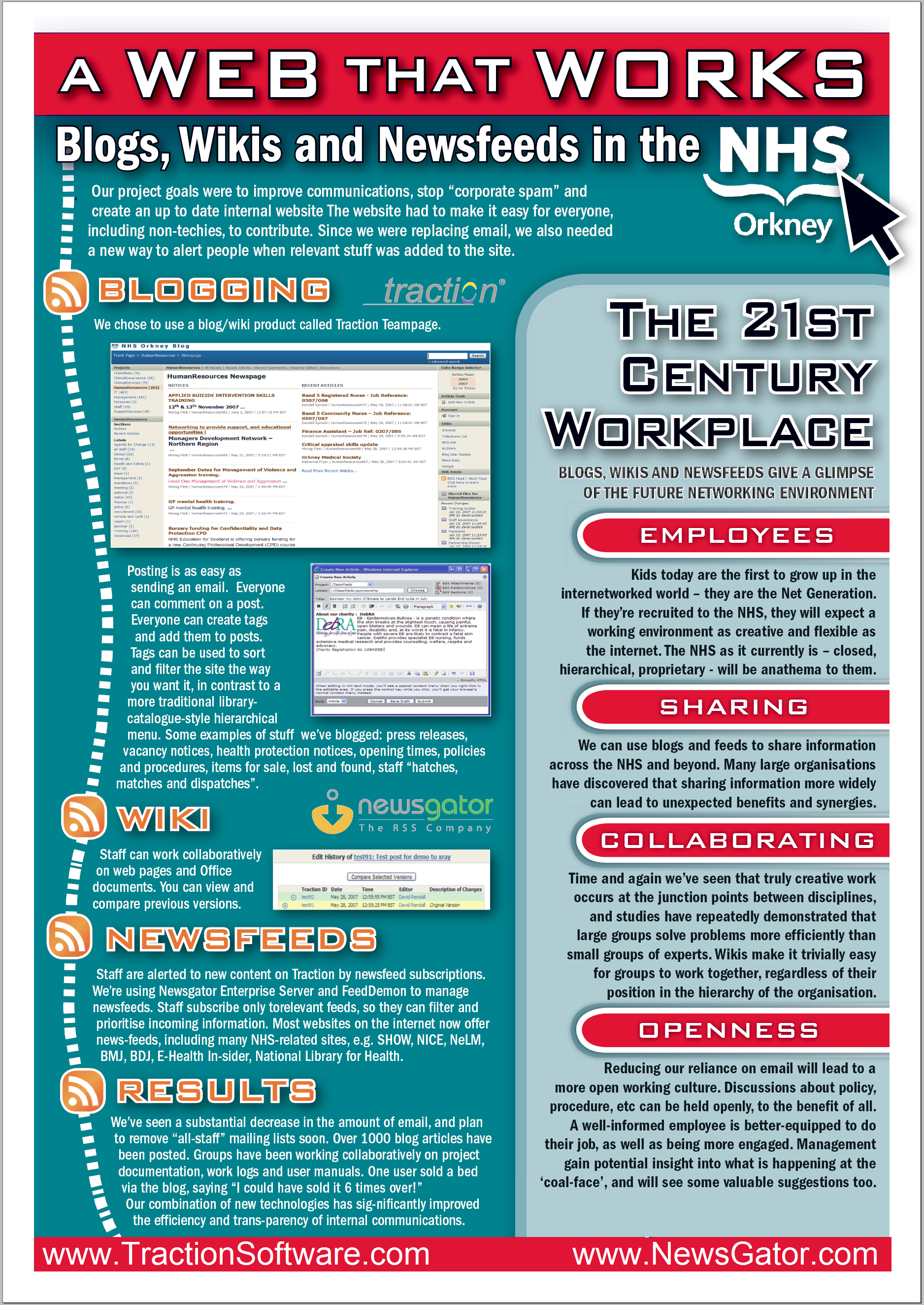 David Rendall, National Health Service Orkney created his A Web That Works blog to complement his poster presentation at the UK's National Health Service conference: Delivering Healthcare in the 21st Century, 11-12 Jun 2007, Glasgow UK. David co-authored a 30 July 2007 Intranet Journal article about his experience with Traction Software's Jordan Frank. Visit David's blog ! To download a full-size copy of David's poster (3.