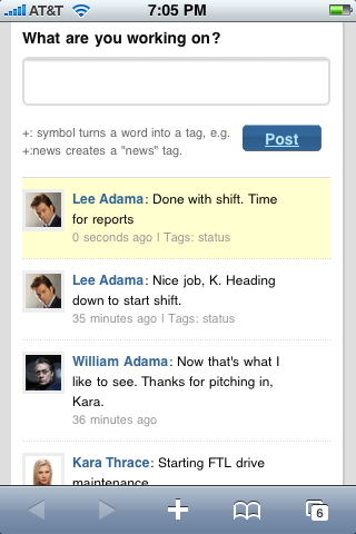 Because the interaction is supported in Traction, conversations you might otherwise have in IM or Twitter can take place securely within a TeamPage context with a rich content, tagging and discussion model. A Live Blog note on a critical issue can easily be tagged and referenced for followup, found in TeamPage search, or disseminated in an TeamPage generated IM, email or RSS stream.
