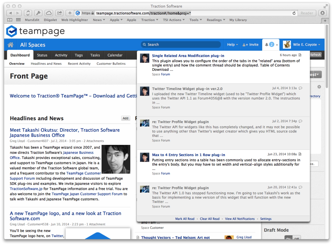 Traction® Traction Software Summer 2014 Release New features include inline-page push Notifications, extending TeamPage's email notifications. Notifications make it simple to focus on activity that's important to you. Get more details, or send a quick reply whether in your office or using your smartphone or tablet. Change what you watch when your priorities and interests change. Available now, contact us for more information or a free trial.