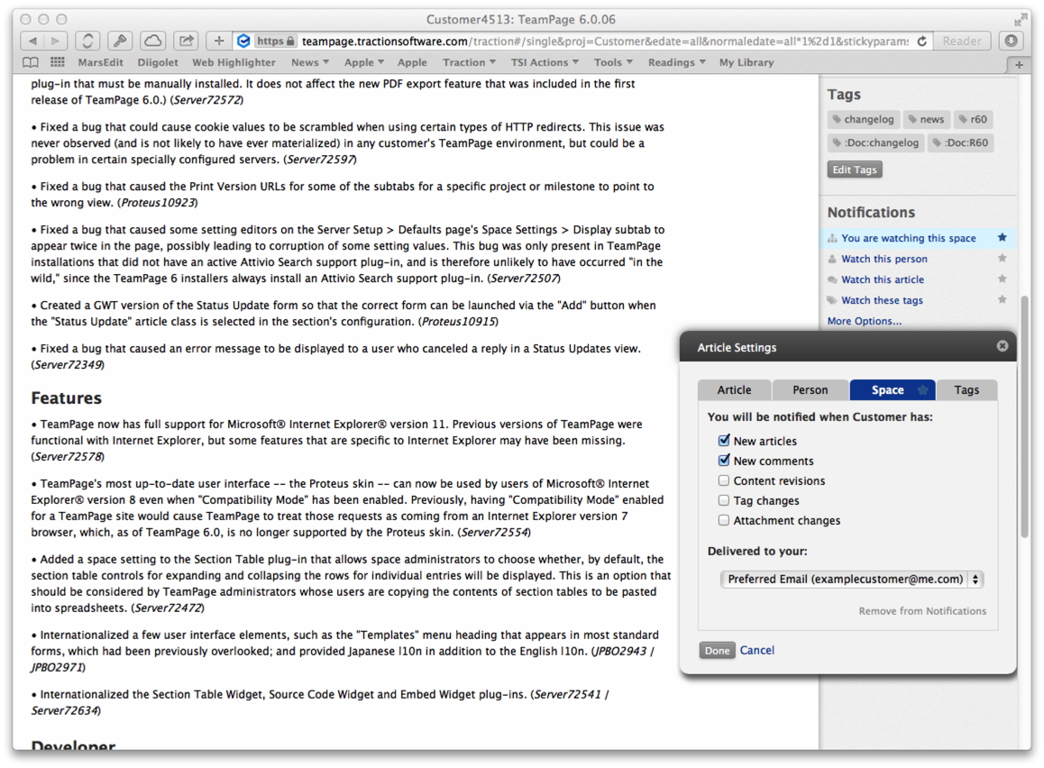 Streamlined Watch interface - Improves the sidebar's Watch menus, used to watch any Space, Person, Tag, or Article and change watch settings. You can also choose to receive automatic notifications for any Task you're mentioned in, changes to articles you create, or discussions you've participated in. Automatic notifications are configurable as personal preferences, using a streamlined user interface.