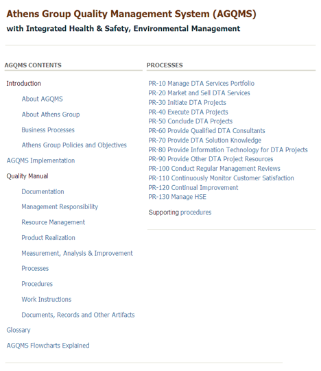 The Traction TeamPage deployment of AGQMS was designed and implemented under the auspices David Wight, the Director of Quality for Athens Group, who has designed several ISO-certified quality systems. After AGQMS was migrated to Traction TeamPage, it moved from a bulky set of processes, procedures, work instructions and documents to a highly visible and easily customizable Intranet system that's known and used by everyone at Athens Group.