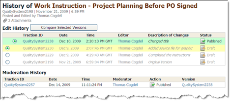 Athens Group chose to make AGQMS a moderated space, creating an audit trail of approvals as well as edits. For example, this page shows both the Edit and Moderation history of one page: