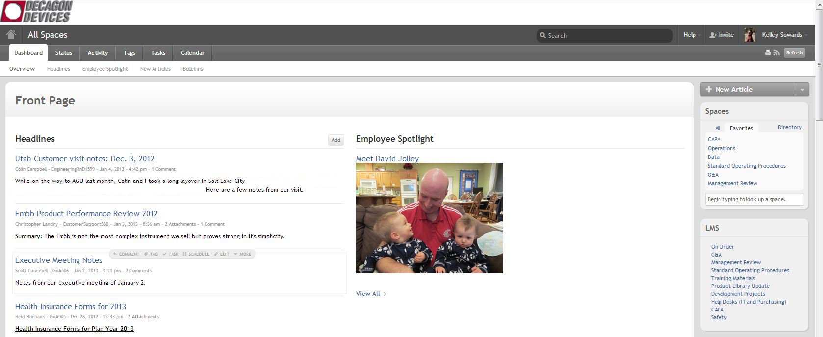 Decagon opens up TeamPage to all employees and their daily work. This includes a consistent flow of headlines, trip and meeting reports, healthcare updates and key new employee information. An Employee Spotlight section adds a personal element and reinforces Decagon's core value: maintaining a tight knit employee community.