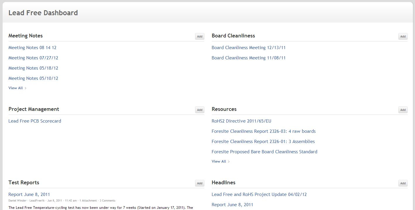 Company-wide projects are also managed in TeamPage. One example is Decagon's transition to Lead Free / RoHS compliance. This company wide initiative required Decagon to eliminate use of lead in all products. The Lead Free Initiative spanned several years, requiring careful attention and involvement of key people from different parts of the company at different stages. The Lead Free TeamPage space at Decagon offers easy access to artifacts that are created throughout the initiative, including cleanliness reports, board meetings notes, and test outcomes.