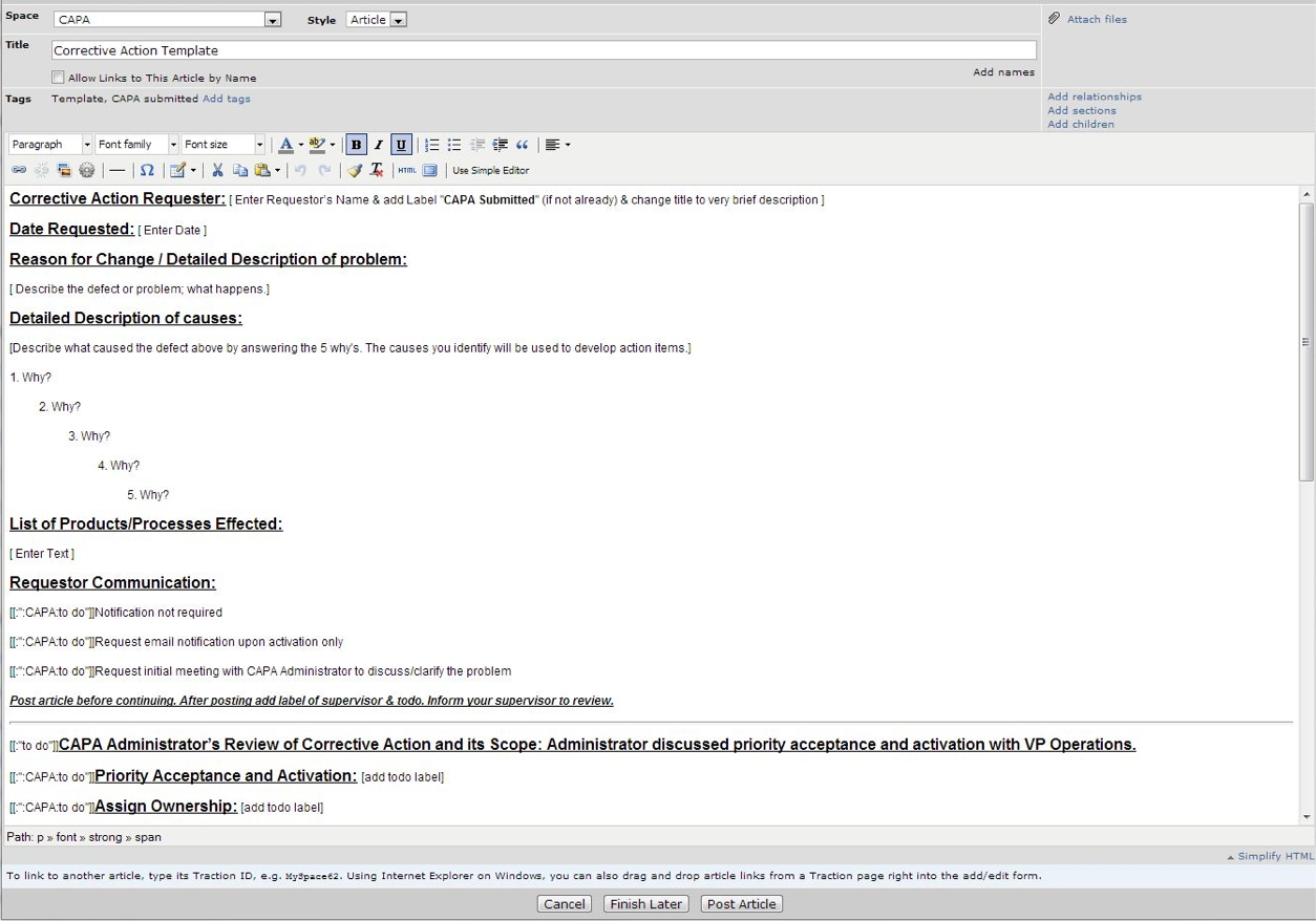 Templates are easy for Decagon to change because each is based on a standard TeamPage article that's copied as the starting point for a new article with the push of a button. When the template is filled in and posted, it appears in one of the Submitted sections on the CAPA dashboard. The employees involved in evaluating changes can then manage their work and move changes through the CAPA process.