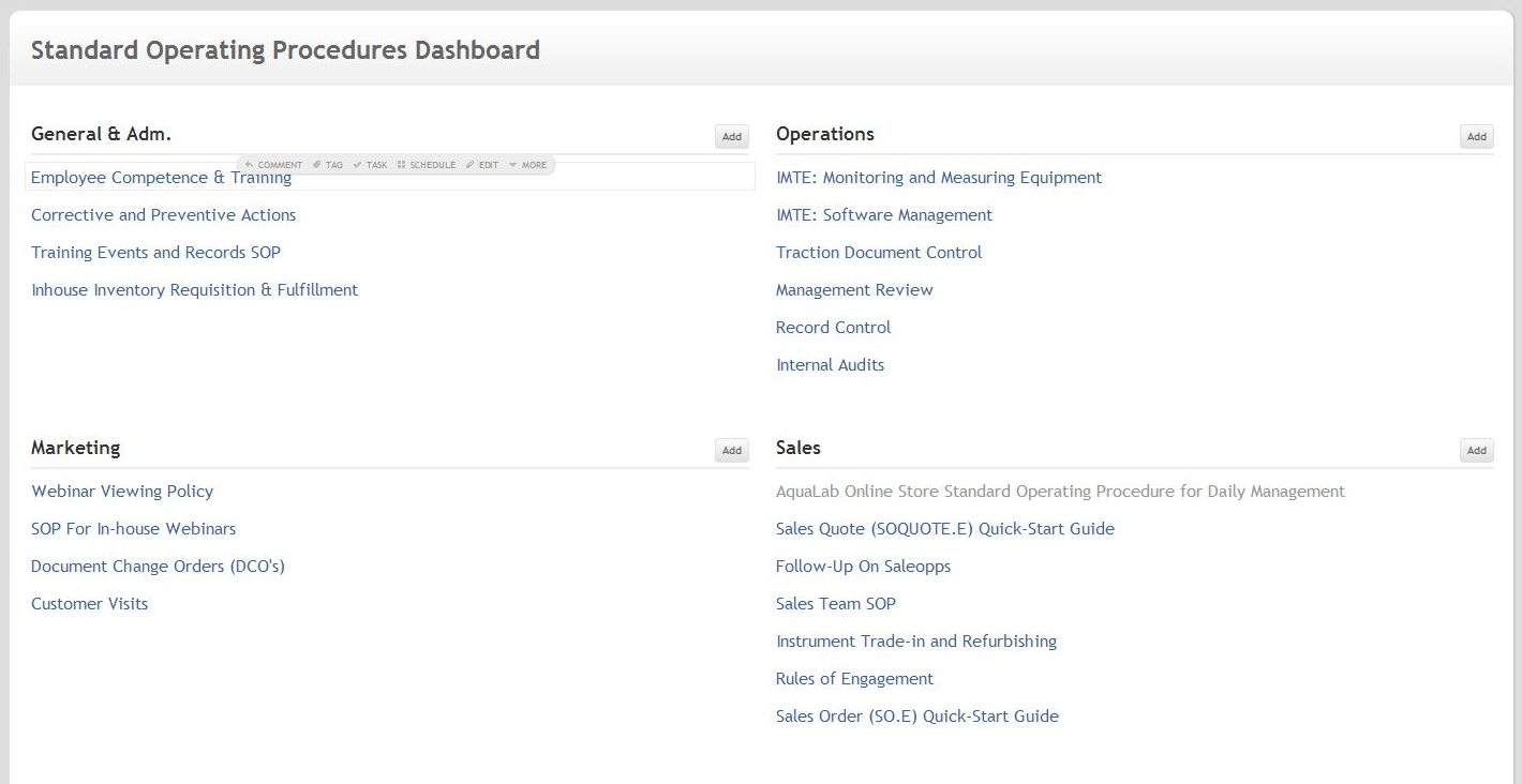 The SOP dashboard shown at above breaks out standard operating procedures by department or function. TeamPage's draft review process is used to review and discuss work in progress revisions before a change update is approved. Changes to a SOP may be made in response to issues raised or changes proposed by CAPAs; if so, the CAPs and SOP are linked in TeamPage. SOPs become living documents, including a record of discussion and rationale explaining how the SOPs evolved.